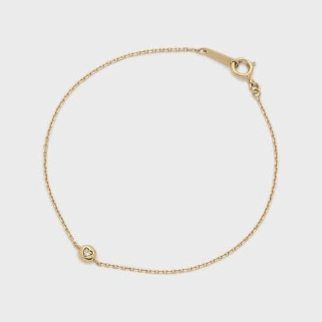 【Soft Gold Series】新しい季節の気配に期待が膨らむ、胸の高鳴りをイメージした小さなハートシルエットの中にダイヤモンドが輝くブレスレット。隠しモチーフのようにさり気ないハートとダイヤモンドを掛け合わせることで、ベーシックなフォルムの中に遊び心を添えました。ワンポイントとしてデイリーに使いやすいサイズ感が手元を優しく印象付けます。※天然石や天然素材を使用しているものは、サイズ・色味・風合いの違いや、若干の傷、内包物の有無などに個体差があります。予めご了承ください。※肌なじみのいいソフトゴールドカラーのコーティングを使用しています。