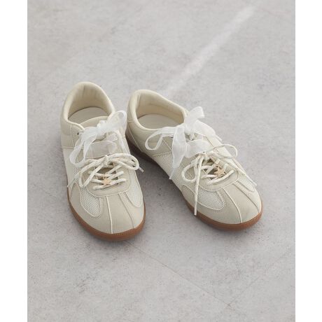 今取り入れたい今季トレンドのフェミニンなスニーカー。軽やかなチュールとスポーツテイストなパラコードのダブルリボンがポイントです。レザー調素材にメッシュを合わせた軽やかさと、ラバーソールで快適な履き心地も魅力的。シンプルながらも存在感があり、いつものコーディネートに合わせるだけで足元がぐっと華やぐおすすめのアイテムです。※モデル着用画像は、光の当たり具合で色味が違って見える場合がございます。※お使いのモニター環境によって商品の色味が違って見える場合がございます。