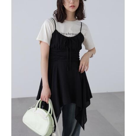 〔fabric&design〕ワッシャー加工を施したシアー素材のチュニックキャミワンピース。胸元はギャザーと共地リボンでバレエコアなかわいさをプラス。ウエスト部分には縦にシャーリングを施しスタイルアップして見えます。イレヘムで甘くなりすぎないようバランスをとっています。裏地付きで透けが気になりずらいです。〔styling〕トレンドのイレヘム×チュニックキャミで韓国っぽスタイリングが決まるアイテム。デニムパンツとレイヤードしてフェミカジな着こなしがおすすめ!