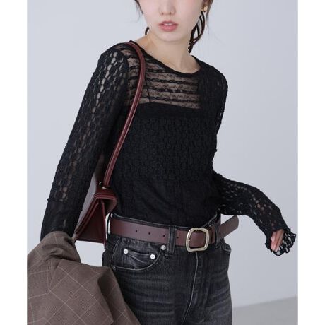 異なるレース柄をパッチワーク状にあしらった上品なロンT。透け感の異なる3種類のレースで女性らしさと抜け感を演出します。やや長めの袖はクシュっとすると手元が華やかになり、ニットやスウェットの袖口からのぞかせるのもおすすめ。シンプルなデザインなのでウエストインもアウトもしやすく、デニムと合わせるだけで映える一枚。コンパクトなシルエットなのでキャミワンピースやジャケットのインナーとしても着回せます。※モデルの着用画像の場合、光の当たり具合により、実際の色味と異なって見えることがございます。色味は、商品単体の画像をご参照ください。