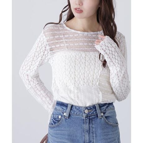 異なるレース柄をパッチワーク状にあしらった上品なロンT。透け感の異なる3種類のレースで女性らしさと抜け感を演出します。やや長めの袖はクシュっとすると手元が華やかになり、ニットやスウェットの袖口からのぞかせるのもおすすめ。シンプルなデザインなのでウエストインもアウトもしやすく、デニムと合わせるだけで映える一枚。コンパクトなシルエットなのでキャミワンピースやジャケットのインナーとしても着回せます。※モデルの着用画像の場合、光の当たり具合により、実際の色味と異なって見えることがございます。色味は、商品単体の画像をご参照ください。