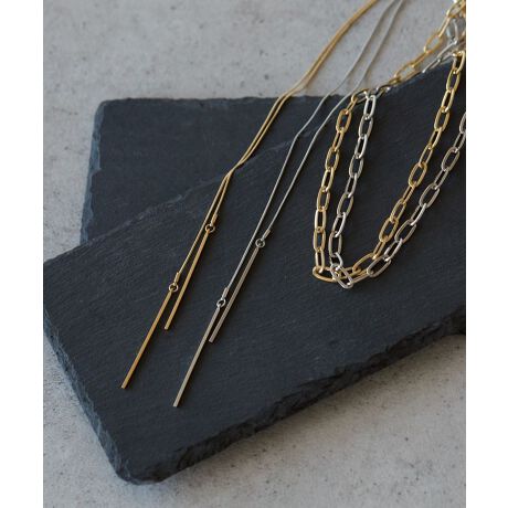 きらりと輝く2種類のチェーンを組み合わせたデザインネックレス。スライドビーズで楽に着脱でき、着こなしに応じてお好みの長さに調整できるのもポイントです。チェーンとメタルバーのどちらを前にしても着用いただける2WAY仕様なのも魅力。ワントーンで合わせるトップスを選ばず、品良く女性らしい雰囲気を演出してくれるおすすめのアイテムです。※モデル着用画像は、光の当たり具合で色味が違って見える場合がございます。※お使いのモニター環境によって商品の色味が違って見える場合がございます。