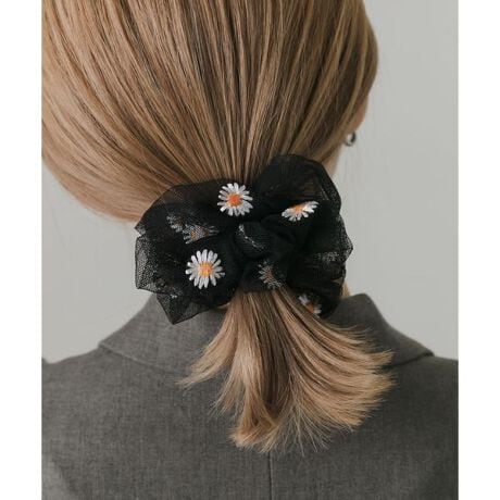 透け感のあるチュール生地に、愛らしいフラワー刺繍をたっぷりと施したシュシュです。