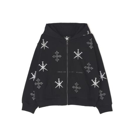 存在感のあるダガークロスモチーフを全体に散りばめたラインストーンで表現したジップフーディー。