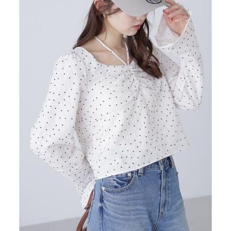 昨年ご好評いただいたブラウスが再登場!今年はトレンドのドット柄と新色を揃えています。軽やかなワッシャーのふくらみ柄とフラットな生地を接結した、程よくテンションのある素材を使用しています。デコルテをキレイに見せてくれるペンタゴンネックに、フロントギャザーで柔らかな印象をプラス。リボンは中心で結んだり、ホルター風にもアレンジ出来ます。すっきりとした袖に、袖口を切り替えたフレアが手元を華やかに演出。一枚着はもちろん、ジャケットやカーディガンのインナーにもおすすめ。袖先を出してレイヤード感を楽しめるのもポイントです。※モデルの着用画像の場合、光の当たり具合により、実際の色味と異なって見えることがございます。色味は、商品単体の画像をご参照ください。