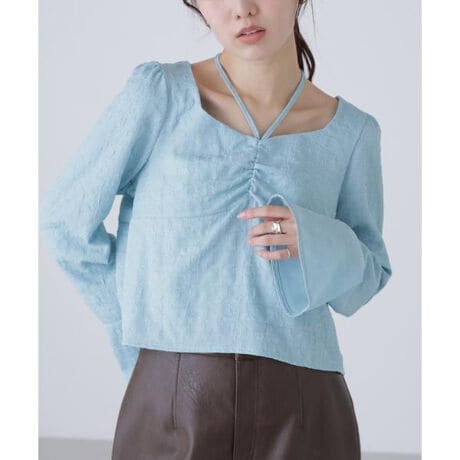 昨年ご好評いただいたブラウスが再登場!今年はトレンドのドット柄と新色を揃えています。軽やかなワッシャーのふくらみ柄とフラットな生地を接結した、程よくテンションのある素材を使用しています。デコルテをキレイに見せてくれるペンタゴンネックに、フロントギャザーで柔らかな印象をプラス。リボンは中心で結んだり、ホルター風にもアレンジ出来ます。すっきりとした袖に、袖口を切り替えたフレアが手元を華やかに演出。一枚着はもちろん、ジャケットやカーディガンのインナーにもおすすめ。袖先を出してレイヤード感を楽しめるのもポイントです。※モデルの着用画像の場合、光の当たり具合により、実際の色味と異なって見えることがございます。色味は、商品単体の画像をご参照ください。