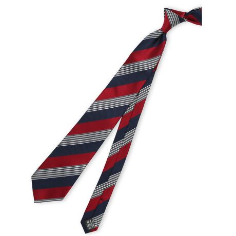 アメリカン・トラディショナルなエッセンスを取り入れた三段縞のストライプ柄です。誠実さや信頼感を与えてくれる爽やかな色柄は、フレッシャーズにも最適。幅広いスーツスタイルに合うので、1本は押さえておきたいアイテムです。結び方は、あらゆるシーンに対応するプレーンノットが王道です。