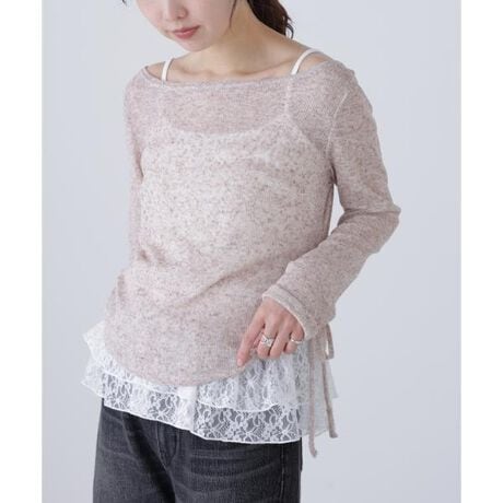 清涼感のあるメランジシアーカットソーと、裾レースフリルキャミソールのセットアイテム。トップスはワンショルダーにもなるボートネックで抜け感があり、両サイドのドロストで着丈調整ができます。インナーは程よい厚みのフライス素材に繊細なレースの裾フリルを施し、シンプルながらフェミニンさと抜け感をプラス。程よくフィットするシルエットと長めの袖丈で、レイヤードしやすく一枚でも映えるデザインです。ワイドデニムやカーゴパンツと合わせて甘辛ミックスなY2Kスタイル、ミニスカート×ロングブーツでフェミニンコーデもおすすめ!甘さとクールさをバランスよく叶え、スタイリングの主役になるアイテムです。※モデルの着用画像の場合、光の当たり具合により、実際の色味と異なって見えることがございます。色味は、商品単体の画像をご参照ください。