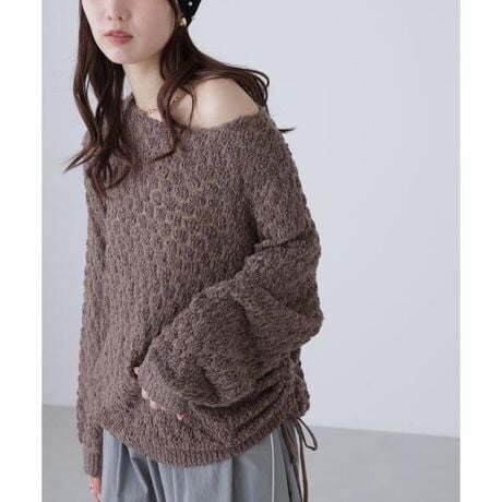 ラスティックな雰囲気のざっくりとしたオーバーサイズニット。テープヤーンと細糸を引きそろえたポコポコとした変わり編みで、立体感のある仕上がりです。ヒップが隠れるくらいの丈感は、両脇のドロストリボンで着丈調節が可能。ボートネックでワンショルダーとしても着用でき、抜け感をだしたラフなデニムスタイルもおすすめ。ミニボトムを合わせるとミニワンピース風にも着回せます。※モデルの着用画像の場合、光の当たり具合により、実際の色味と異なって見えることがございます。色味は、商品単体の画像をご参照ください。