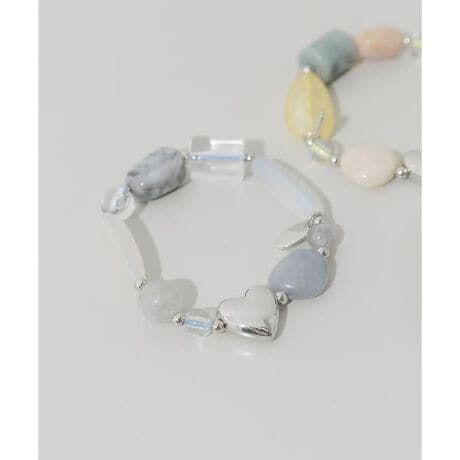 ポップなビーズの中に、ぷっくりとしたシルバーのハートチャームをミックスすることで、甘すぎないエッジの効いた仕上がりに。