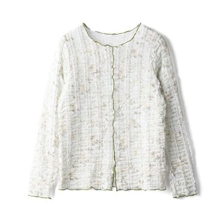 伸縮性のあるレースに花柄プリントを重ねた、着映え力の高いプルオーバー。