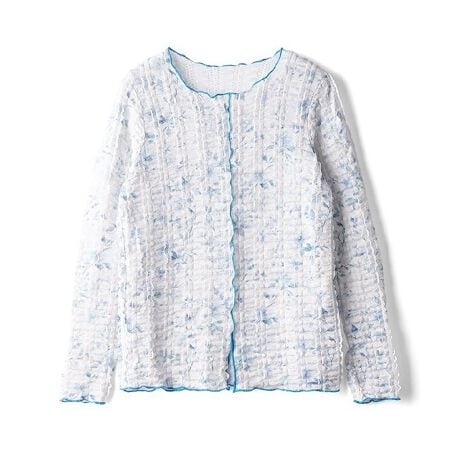 伸縮性のあるレースに花柄プリントを重ねた、着映え力の高いプルオーバー。