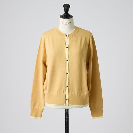 ベーシックなカーディガンのフォルムに、まるで2枚重ねているかのように、ちらりと覗く配色デザインがポイント。
