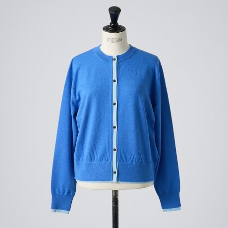 ベーシックなカーディガンのフォルムに、まるで2枚重ねているかのように、ちらりと覗く配色デザインがポイント。