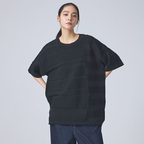 特殊な編み方でランダムなボーダー柄デザインにし、無地ながら凹凸が存在感のあるニットTに仕上げました。