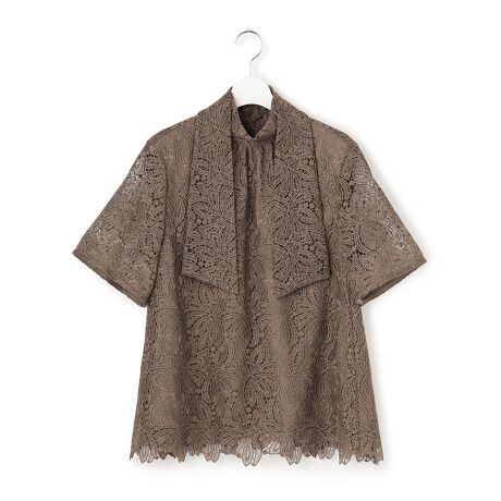 お祝いの場にふさわしい、リボンブーケモチーフが目を引く総レース仕立てのブラウス。襟元のリボンは、前に垂らしてさっとひと結びしたり、後ろで軽く結ぶだけで、品のある華やかな印象を演出します。結婚式やパーティーなどのドレスシーンはもちろん、きれいめパンツやデニムなどお手持ちのボトム合わせて、普段使いにも活躍する着回し力の高さも魅力です。カラーはエレガントな洒落感が漂うブラウン(#030)と、清楚な気品を感じさせるネイビー(#075)の2色展開です。