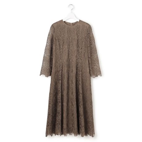 お祝いの場にふさわしい、リボンブーケモチーフが目を引く総レース仕立てのドレス。程よい肌見せが叶う素材感を活かした、一枚で品のある美しいシルエットが完成するデザイン。袖口と裾にスカラレースを配して細部まで華やかに仕上げています。カラーはエレガントな洒落感が漂うブラウン(#030)と、清楚な気品を感じさせるネイビー(#075)の2色展開です。