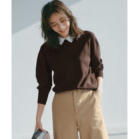 目の詰まった上品な総針編みで仕立てた、前後どちらでも着用可能な衿付きプルオーバーです。清潔感のあるオフホワイトの配色衿が顔周りを明るく演出し、洗練された印象を与えます。ふんわりとしたパフスリーブが女性らしい柔らかな雰囲気をプラスし、さりげないブランドロゴの刻印ボタンがアクセントになっています。 シンプルなボトムスに合わせるだけで、オフィスシーンから休日のお出かけまで、幅広いスタイリングが完成します。デニムと合わせてカジュアルダウンしたり、きれいめパンツやスカートと合わせて上品な着こなしを楽しんだり、様々なコーディネートをお楽しみいただけます。 カラーは、シックで着回し力抜群のブラック(#005)、上品で知的な印象を与えるネイビー(#075)、落ち着きがありこなれた印象をプラスするダークブラウン(#035)の3色展開です。