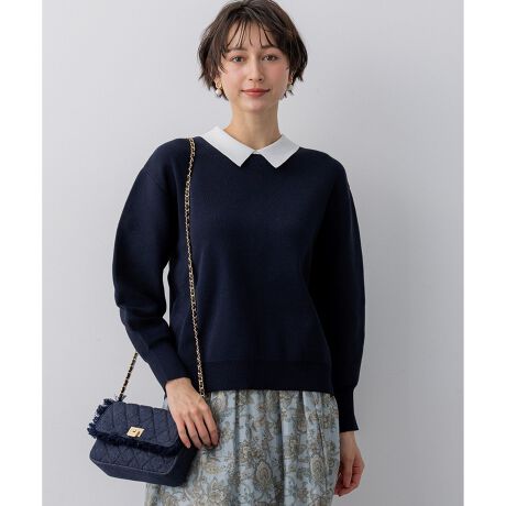 目の詰まった上品な総針編みで仕立てた、前後どちらでも着用可能な衿付きプルオーバーです。清潔感のあるオフホワイトの配色衿が顔周りを明るく演出し、洗練された印象を与えます。ふんわりとしたパフスリーブが女性らしい柔らかな雰囲気をプラスし、さりげないブランドロゴの刻印ボタンがアクセントになっています。 シンプルなボトムスに合わせるだけで、オフィスシーンから休日のお出かけまで、幅広いスタイリングが完成します。デニムと合わせてカジュアルダウンしたり、きれいめパンツやスカートと合わせて上品な着こなしを楽しんだり、様々なコーディネートをお楽しみいただけます。 カラーは、シックで着回し力抜群のブラック(#005)、上品で知的な印象を与えるネイビー(#075)、落ち着きがありこなれた印象をプラスするダークブラウン(#035)の3色展開です。