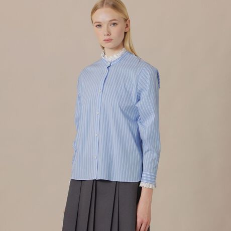 衿と袖口にレースをあしらったブラウスです。トラッドながら程よくエレガントな印象です。ニットのプルオーバー、カーディガン、ジャケット、コートのインナーとして活躍します。同素材のブラウス(品番:G5M01715)もご用意しております。