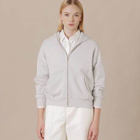胸元にブランドロゴを施したフーディです。ポケット部分はすっきりする様パターン調整し、肘はダーツで立体的に、フードはボリュームが出る様二重仕立てで仕上げています。柔らかく張り感のある素材を纏う着心地の良さを感じていただけます。1枚でもノーカラーコートからフードを出したスタイリングにもコーディネートしていただけます。