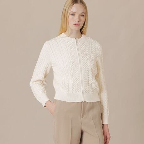前身頃のトラディショナルなケーブル編みが、立体的で表情豊かなニットカーディガンです。後ろ身頃と袖は、全面鹿の子編みですっきり仕上げています。トレンドのクロップド丈で、着るだけでコーディネートが仕上がるデザインです。
