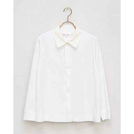 襟元に同色系のコットンレースをあしらいシンプルな中にさりげない女性らしさをプラスしています。