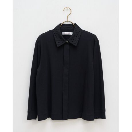 襟元に同色系のコットンレースをあしらいシンプルな中にさりげない女性らしさをプラスしています。