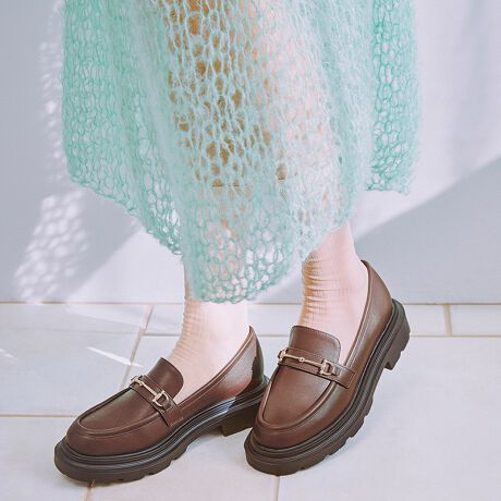 凹凸のあるボリュームソールが目を引くローファーは、重厚感のある見た目ながら、軽量なので足への負担が少ないのが嬉しい。コバデザインで足元にさりげないアクセントをプラス。ブラウンとベージュはヒールとのバイカラーの配色でコーディネートを引き締めてくれる。カジュアルからきれいめまで幅広いスタイルに合わせやすく、デイリーに活躍する優れもの。サンプルにて撮影をしておりますので、中敷色、ロゴ色、裏地の色の仕様に変更がある場合がございます。あらかじめご了承ください。