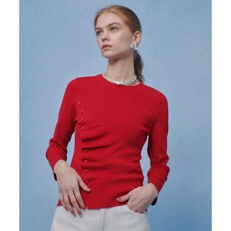 ボタンとニットのドレープがアクセントになったプルオーバー。