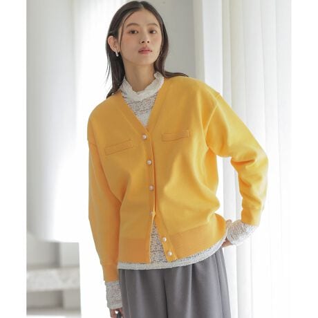 ■デザイン・リラクシーなシルエットのVネックカーディガンは、たっぷりとした分量感が魅力。・羽織ったときに丸みが出るようにこだわったシルエットで、シンプルでありながら少しだけエッジを効かせた1枚です。・フロント釦は少し大きめのパール釦を使い、間隔を狭めに配置することで全体のアクセントにしています。・裾から2番目までの釦を外してペプラムシルエットのような【X】ラインを出すのもおすすめです。・独特な立体感のあるフォルムがモードさを与え、360度どこから見ても抜け目ない印象的な1枚映えニットです。