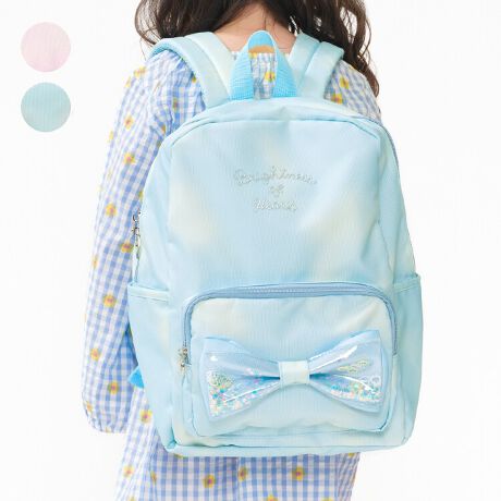 撥水機能付きのポリエステルを使用したリュック。前に留め具も付いているので、肩紐もずり落ちにくい仕様です。背中と接する面がエアメッシュになっているので、肌あたりが柔らかく通気性◎内ポケットにはお名前ネームタグ有り。ビニールのリボンにはキラキラのスパンコールが入っており、トレンド感のあるリュックです。【アイテム】 雑貨 カジュアル お洒落 オシャレ かわいい 可愛い 普段着 デイリーウェア お出かけ 子ども こども 女児 女の子 ガールズ キッズ ベビーサイズ トドラーサイズ 幼稚園 保育園 小学校 通園 通学 小学生 遠足 旅行 2026年春夏物新作 丸高衣料 小物 りぼん ピンク サックス 水色 キッズフォーレ