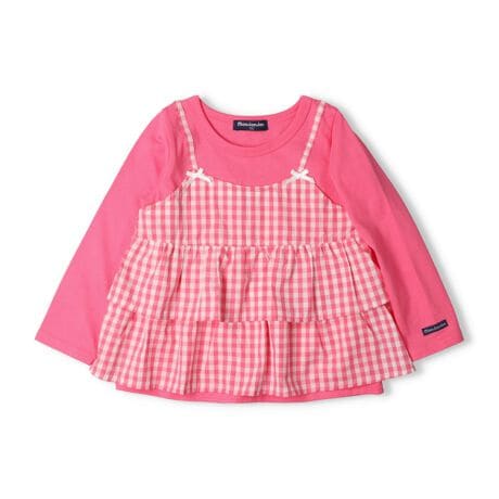 リボンが付いたギンガムチェック柄のキャミの重ね着風デザイン。1枚で可愛く着られる長袖Tシャツ、ロンT。同じギンガムチェックを使ったワンピース(M26303)があるので、姉妹でお揃い、ペアコーデ、リンクコーデもおすすめ!おそろいアイテムはギフトやプレゼントにも人気です!【アイテム】トップス シンプル ガーリー フェミニン カジュアル お洒落 オシャレ かわいい 可愛い 普段着 デイリーウェア お出かけ着 お外着 お外遊び着 子ども こども 女児 女の子 ガールズ キッズ ベビーサイズ トドラーサイズ 幼稚園 保育園 小学校 通園 通学 小学生 2026年春夏物新作 丸高衣料 ロングスリーブ 長袖 ブルー 青色 ビビットピンク ムージョンジョン コットン100% 綿100%