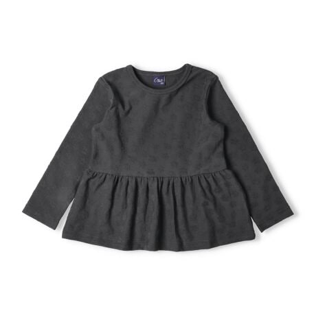 無地ライクに着られるお花柄ジャガードの長袖Tシャツ、ロンT。伸びがよく、着やすいアイテム。【アイテム】トップス シンプル ガーリー フェミニン カジュアル お洒落 オシャレ かわいい 可愛い 普段着 デイリーウェア お出かけ着 お外着 お外遊び着 子ども こども 女児 女の子 ガールズ キッズ ベビーサイズ トドラーサイズ 幼稚園 保育園 小学校 通園 通学 小学生 2026年春夏物新作 丸高衣料 ロングスリーブ 長袖 フラワー ブラック 黒色 オフホワイト 白色 クレセント