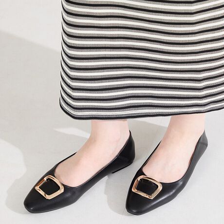 高級感のあるゴールドの変形モチーフを施したフラットパンプスは、踵を踏んでも履けるバブーシュ仕様で、足への負担が少ないのが魅力的。さらに、柔らかなアッパー素材と厚手クッション入りの中敷、つま先部分にもクッションが入っているので長時間の歩行も安心。きれいめからカジュアルまで合わせやすいデザインでオンオフ問わず活躍してくれる万能パンプス。【オススメPOINT】●厚手クッション入り ●つま先クッション入りサンプルにて撮影をしておりますので、中敷色、ロゴ色、裏地の色の仕様に変更がある場合がございます。あらかじめご了承ください。