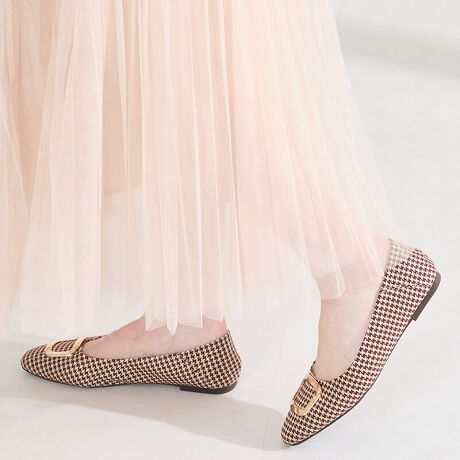 高級感のあるゴールドの変形モチーフを施したフラットパンプスは、踵を踏んでも履けるバブーシュ仕様で、足への負担が少ないのが魅力的。さらに、柔らかなアッパー素材と厚手クッション入りの中敷、つま先部分にもクッションが入っているので長時間の歩行も安心。きれいめからカジュアルまで合わせやすいデザインでオンオフ問わず活躍してくれる万能パンプス。【オススメPOINT】●厚手クッション入り ●つま先クッション入りサンプルにて撮影をしておりますので、中敷色、ロゴ色、裏地の色の仕様に変更がある場合がございます。あらかじめご了承ください。