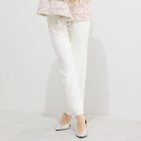 伸縮性のある素材で自宅でも洗えるのでオフィススタイルやきれいめスタイルはもちろん、セレモニーなどのきちんとした場面にも対応できるエレガントパンツ。