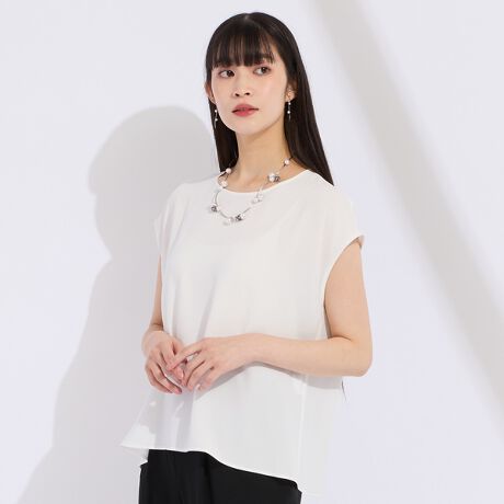 ジャケットのインナーとしておすすめのきれいめブラウス。後ファスナーで前はすっきりと仕立てているので衿の有無にかかわらず合わせやすい。シンプルな衿ぐりでネックレスとの相性も◎。