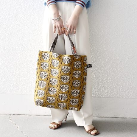 キャメルは存在感のあるタイガーモチーフ、ブルーは爽やかなLAロゴが全面にあしらわれた、遊び心あふれるトートバッグ。