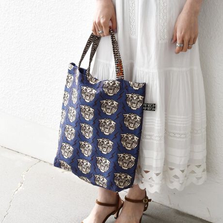 キャメル、グリーン、ネイビーは存在感のあるタイガーモチーフ、ブルーは爽やかなLAロゴが全面にあしらった遊び心あふれるトートバッグ。