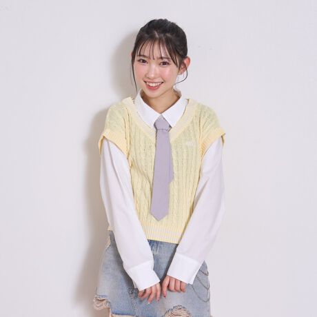 ネクタイつきのシャツをレイヤードしたケーブル編み風のニットです。