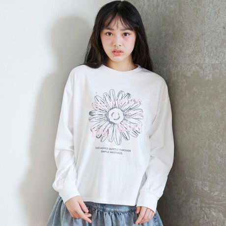 立体的なロゴにおしゃれなプリントを組み合わせた長袖Tシャツです。ソフトな風合いのコットン素材を使用し、快適な着心地に仕上げました。ゆとりのあるリラックスしたシルエットで、デイリーユースに活躍。刺しゅうの裏に「あて布」はございません。