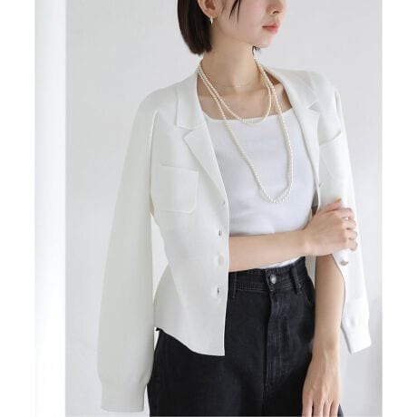洗練された印象で着こなせる、開襟デザインのアンサンブル。