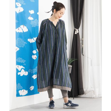 ドットを織り交ぜたストライプ柄が、すっきりとした印象を演出するワンピース。