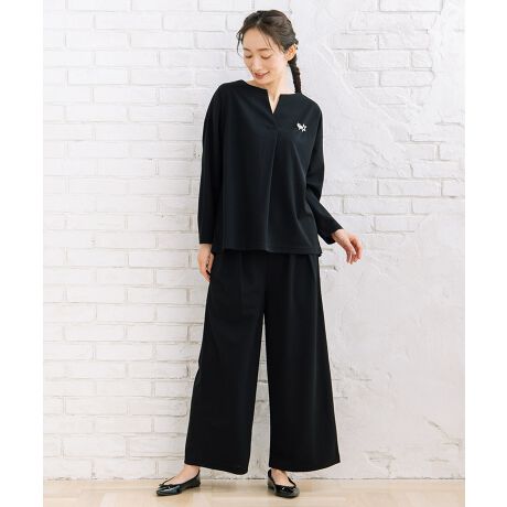 キーネックの抜け感が上品なカットソーと、落ち感のあるワイドタックパンツのセット。