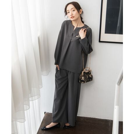 キーネックの抜け感が上品なカットソーと、落ち感のあるワイドタックパンツのセット。