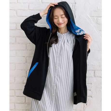 ベーシックなジップフーディに、ポケットとフード裏のマチルダプリントがアクセント。