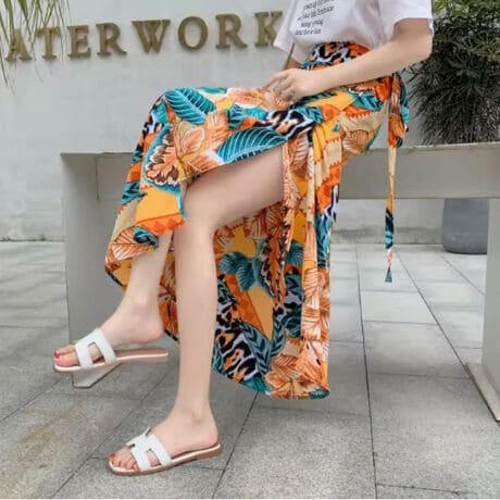 -インパクトある柄の巻きスカートで、巻き方を変えればワンピースや羽織りとしても着用できます。