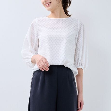 幾何柄のジョーゼット生地を使用した、抜け感のある七分袖プルオーバー。一枚で着用しやすいクルーネックデザインに、袖のボリュームとギャザーで程よい華やかさを添えています。軽やかな素材感が季節感を演出し、デニムでカジュアルに、きれいめパンツで上品にと幅広いスタイリングに対応します。オンオフ問わず取り入れやすい一着です。