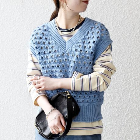 ざっくりとしたメッシュ編みが特徴のVネックニットベスト。
